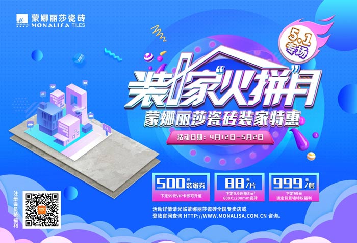 人間最美四月天,不負(fù)春光不負(fù)卿。春天的腳步漸行漸遠(yuǎn),“五一”小長假也正在向我們招手。說起來啊,“五一”假期一直以來都是家裝的旺季,為了給受疫情影響而無法如期進(jìn)行家裝的您,帶來實實在在的消費“優(yōu)惠”和“讓利”,蒙娜麗莎瓷磚于4月14日—5月2日舉辦主題為“裝家‘火拼’月”的五一線上特惠活動,力求為更多的家庭帶來溫馨的消費體驗,凡登入微信小程序“蒙娜麗莎MCS即享如下優(yōu)惠: