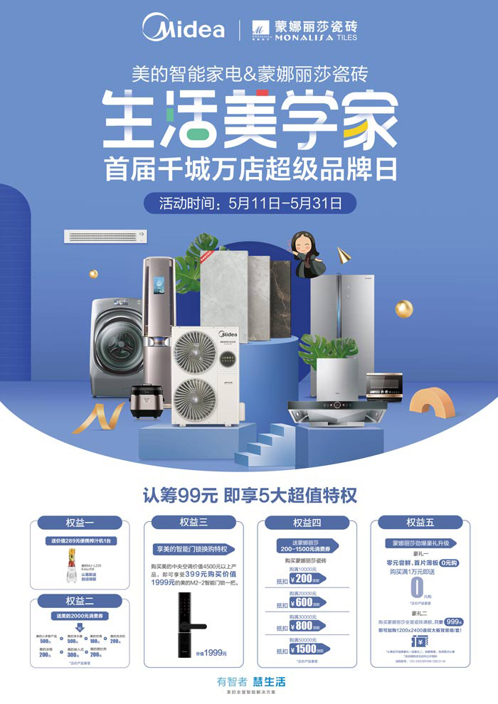 5月11日至5月31日,蒙娜麗莎瓷磚“牽手”美的智能家電,組成夏日家裝“最強CP”,發(fā)起一場以“打造生活美學家”為主題的“全網(wǎng)性、全品類、全渠道、全區(qū)域”的聯(lián)合促銷盛惠。活動將以用戶體驗為基點,共同給出全屋一站式瓷磚&家電的解決方案,為消費者帶來夏日無憂家裝體驗。