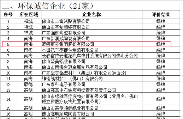 11月17日,佛山市生態(tài)環(huán)境局發(fā)布了《關(guān)于2019年度佛山市企業(yè)環(huán)境信用評價結(jié)果的通知》,蒙娜麗莎集團再次獲評“佛山市環(huán)保誠信企業(yè)”(綠牌),這是蒙娜麗莎集團自2015年以來,連續(xù)5年獲得佛山市企業(yè)環(huán)保綠牌。