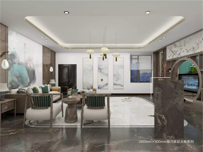 煙云、山川、流水……從具象到抽象,無不透露出從容靜雅、心隨意遠的樸實和超然。與概念化、符號化的山水畫不同,蒙娜麗莎大板系列背景墻復刻自然的流動之美,情景交融,虛實相生,呈現出一種“只緣身在此山中”的意境。